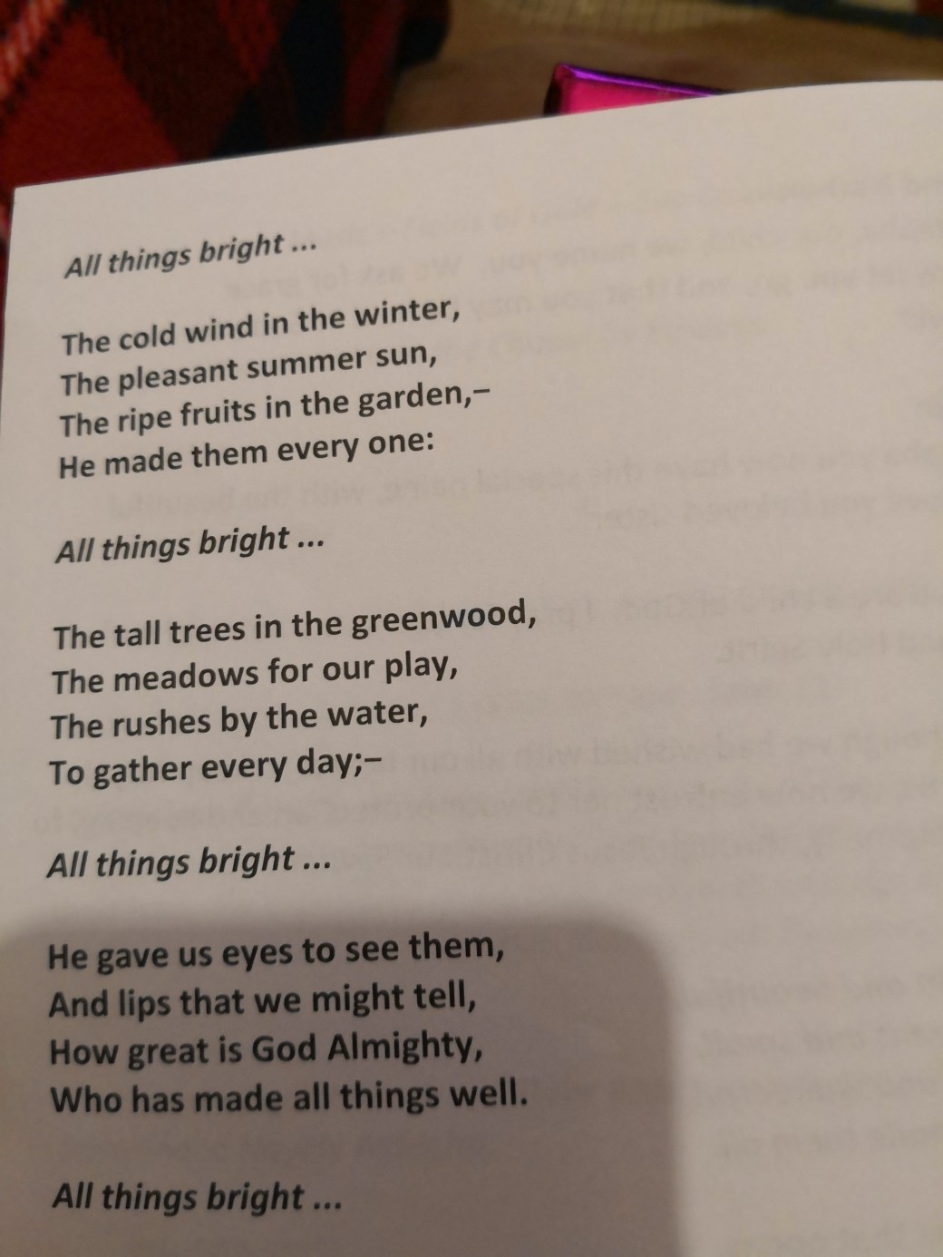 Then we sang all things bright and beautiful and then it was time for me to read the poems