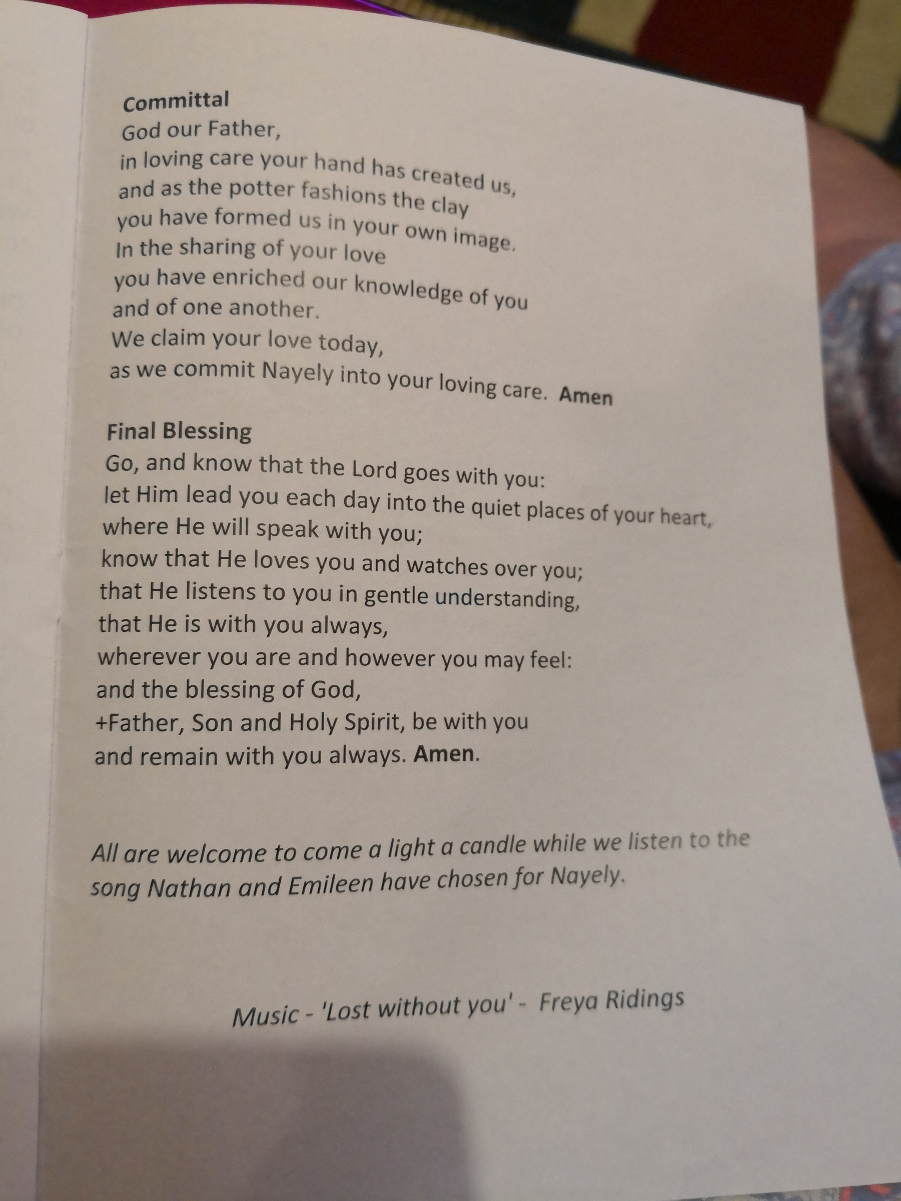 After this Nathan and I read a little piece that the Chaplin had written in for us and then it was the lord’s prayer and a prayer of commendation followed by the committal and final blessing. It had all gone too quickly, as Julia asked us all to take a minute to think about Nayely and all the dreams we lost for her whilst we played a final song we knew this was it, the funeral was over and our little girl would soon be gone forever! I pressed play, Freya Ridings, lost without you, and everyone started getting up to light candles for Nayely. Finally we lit our candles, I kissed her photo, wiped my tears and sat back in my seat until the song finished. At that point we asked people if they would like to join us at the wake then to please make their way over and we would meet them there once we’d seen Nayely off. They all came one by one and hugged us before they left, they kept saying how brave we were and how we’d done her proud and I just kept thinking that if I’d kept her safe in the first place that would have been doing her proud!
