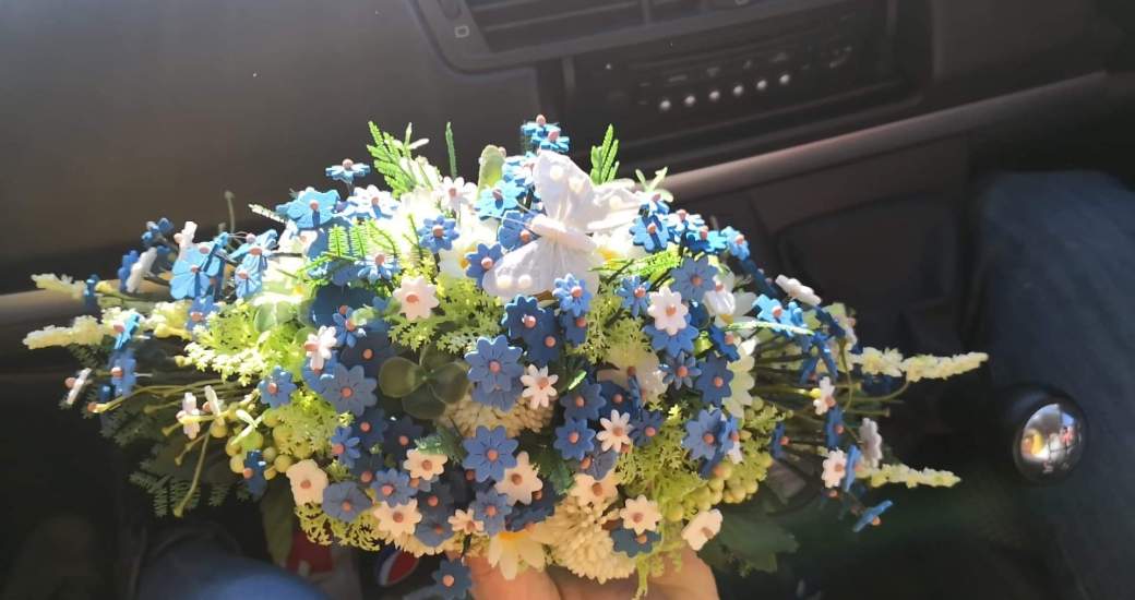 Once I’d said goodbye again we went to look at her flowers, as I got out of the car I saw some that’s had been made up and my heart sank, I hoped they weren’t hers, they were too big and clumsy! We went in and there was the most beautiful and delicate display of foam daisy’s and forget-me-nots it was so much better than I’d imagined, there was just one thing missing, it needed a butterfly but it had to be small so as not to overbalance it, the lady in the shop pulled out the perfect sized little white butterfly and placed it on the wreath, perfect! The shop is called flower magic, and it truly is magic, the lady had hand clipped each flower and attached them perfectly because in her words “I did look for readymade ones but nothing seemed delicate enough for your little girl and I wanted it to be perfect!” And they are, everything we wanted and more!
