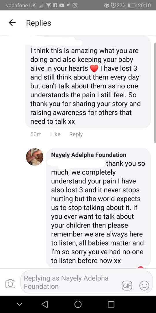 If you know someone who needs support following baby loss then search for NAYELY ADELPHA FOUNDATION on Facebook and Instagram and we will try to help everyone who makes contact.